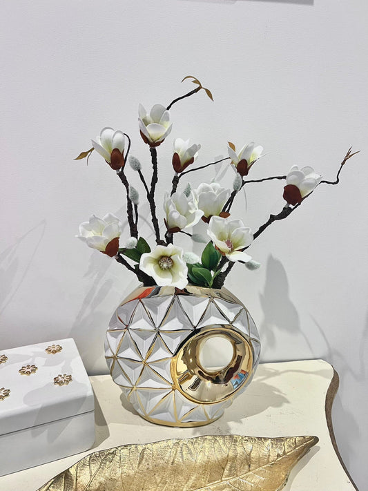 Indulge in the luxurious Faux Magnolia Flowers Arrangement, available in sets of 3 or 5, with the option to add more units for a fuller, opulent display. Each stem boasts two stunning magnolia blossoms and verdant foliage, crafted with lifelike detail and flexibility. Enhance your space with a tasteful and understated touch of beauty by placing these elegant blooms in a vase on your kitchen top.