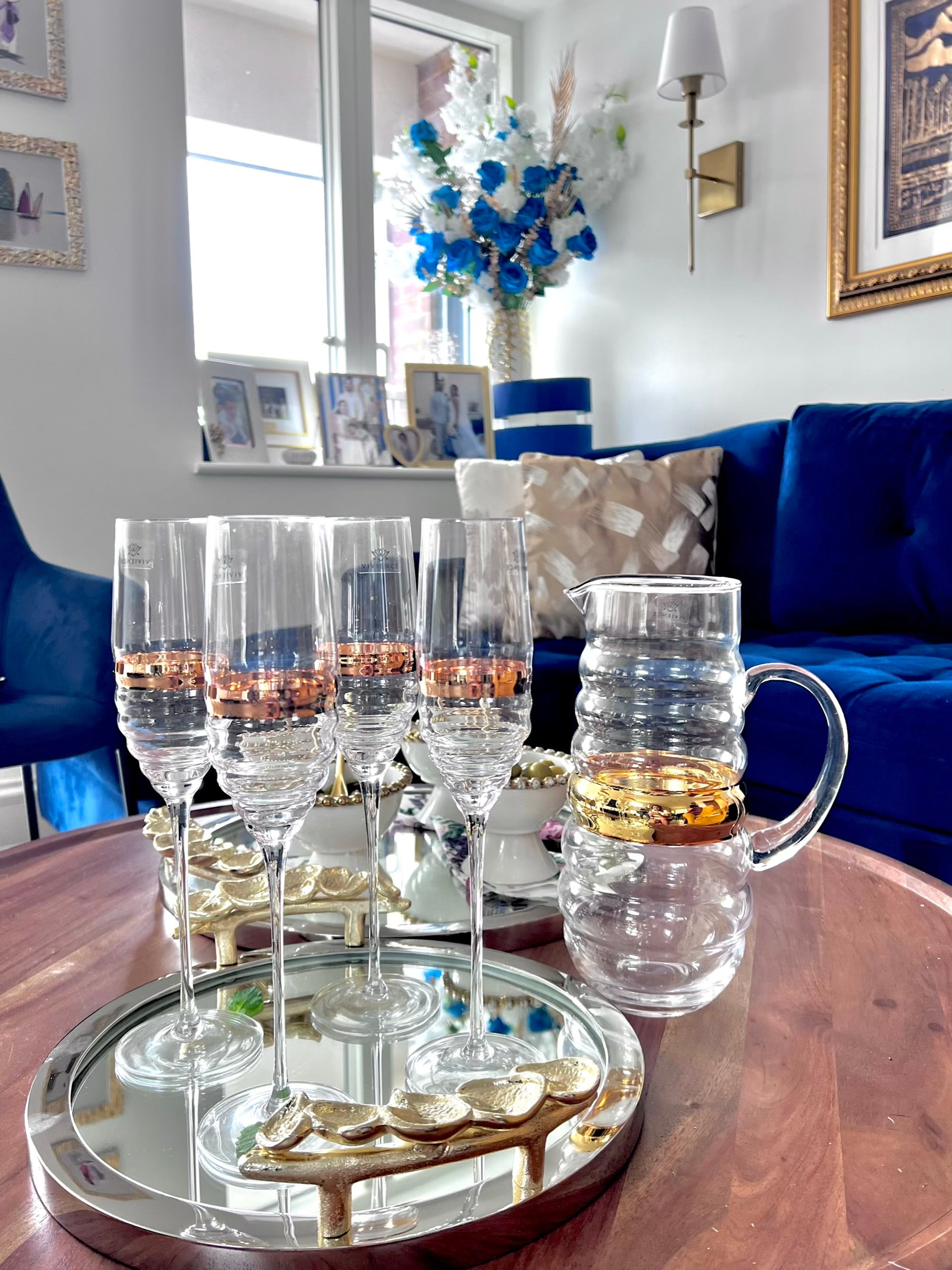 Introducing our elegant glass pitcher adorned with a linear design and a luxurious gold stripe. A sophisticated addition to your collection that exudes a polished and visually stunning presence. Crafted with top-quality materials, it adds a touch of class and refinement to any gathering. Enjoy your favorite beverages with style and grace.