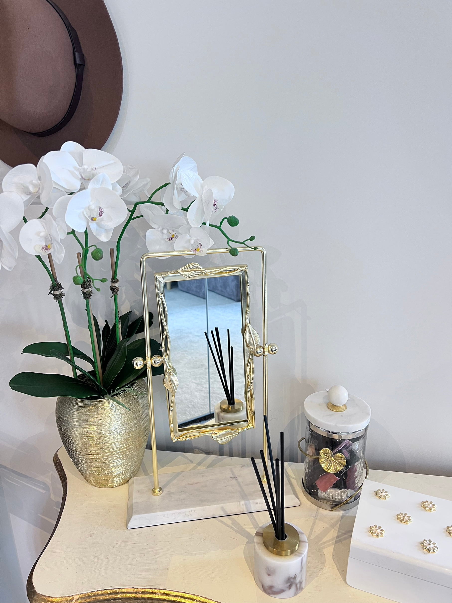 Gold Leaf Design Table Mirror with Marble Base (with imperfection)