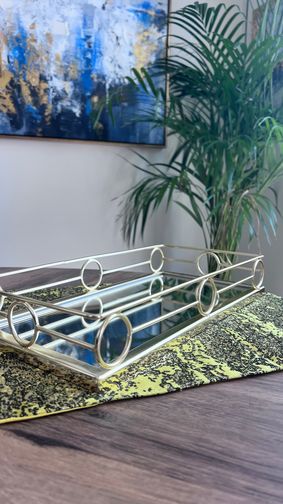 Elevate your home decor with this Gold Round Mirror Tray Loop Design, exquisitely crafted by skilled artisans for a touch of modern simplicity and elegance. Perfect for serving or displaying, this sturdy and tasteful design adds a sophisticated touch to any corner or table.