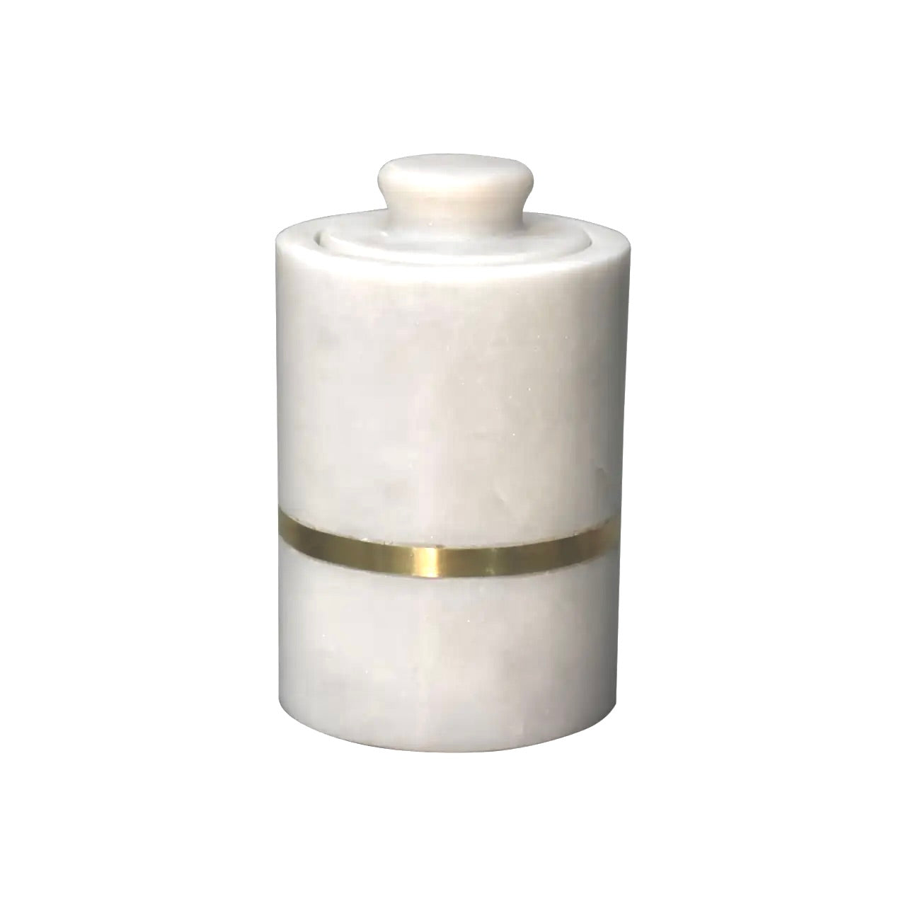 This 5-piece round bathroom set is made from white marble adorned with a brass band. Consists of a soap dish, soap dispenser, toothbrush holder, cosmetic box holder, and tray. A beautiful set of accessories for your bath as well as making a unique gift choice.