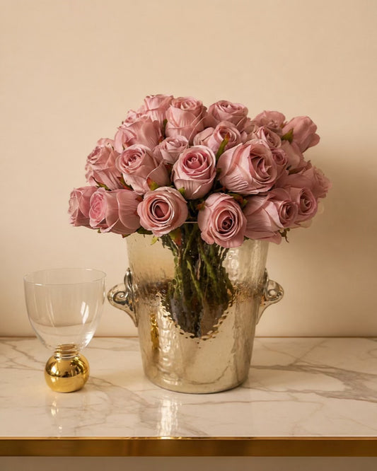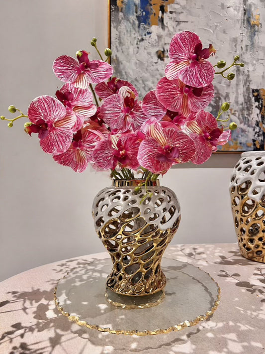 This lovely bouquet comprises 6 stems of Gypsophilas. A work of art that adds a touch of luxury to any room. This sophisticated bouquet creates the perfect contrast between delicate and bold. Its golden accents bring a touch of glamour to any space.
